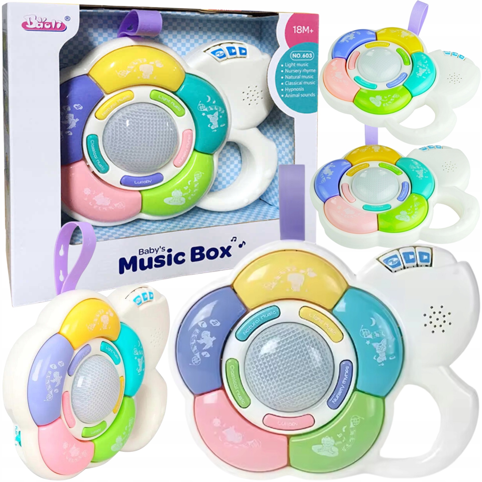 Интерактивная музыкальная шкатулка в форме цветка — универсальная игрушка, предлагающая множество различных функций. Он содержит успокаивающий свет и воспроизводит различную музыку и звуки природы. Благодаря кнопкам разных цветов дети могут исследовать разнообразную палитру цветов. Игрушка также позволяет распознавать звуки животных и имеет функцию таймера, которая автоматически выключает музыкальную шкатулку через определенное время. Возможность повесить ее на кровать и отрегулировать громкость — это дополнительные функции, которые делают музыкальную шкатулку полноценной и практичной игрушкой для детей. Игрушка изготовлена из безопасных и прочных материалов и имеет округлую форму, что позволяет детям от 18 месяцев.
