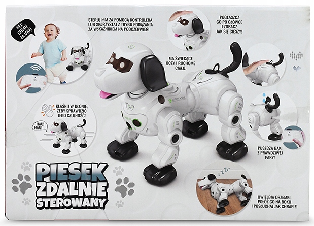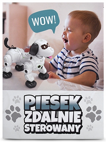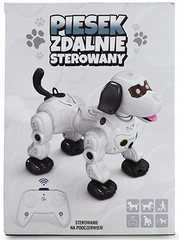 В комплект входит большой робот (21 см) в виде милой собачки, контроллер/пульт управления и красивая, большая упаковка со стеклянным окошком Вся вещь идеальна для ребенка. подарок! Дополнительным преимуществом является полностью польская упаковка, на которой вы найдете описание функций собачки.