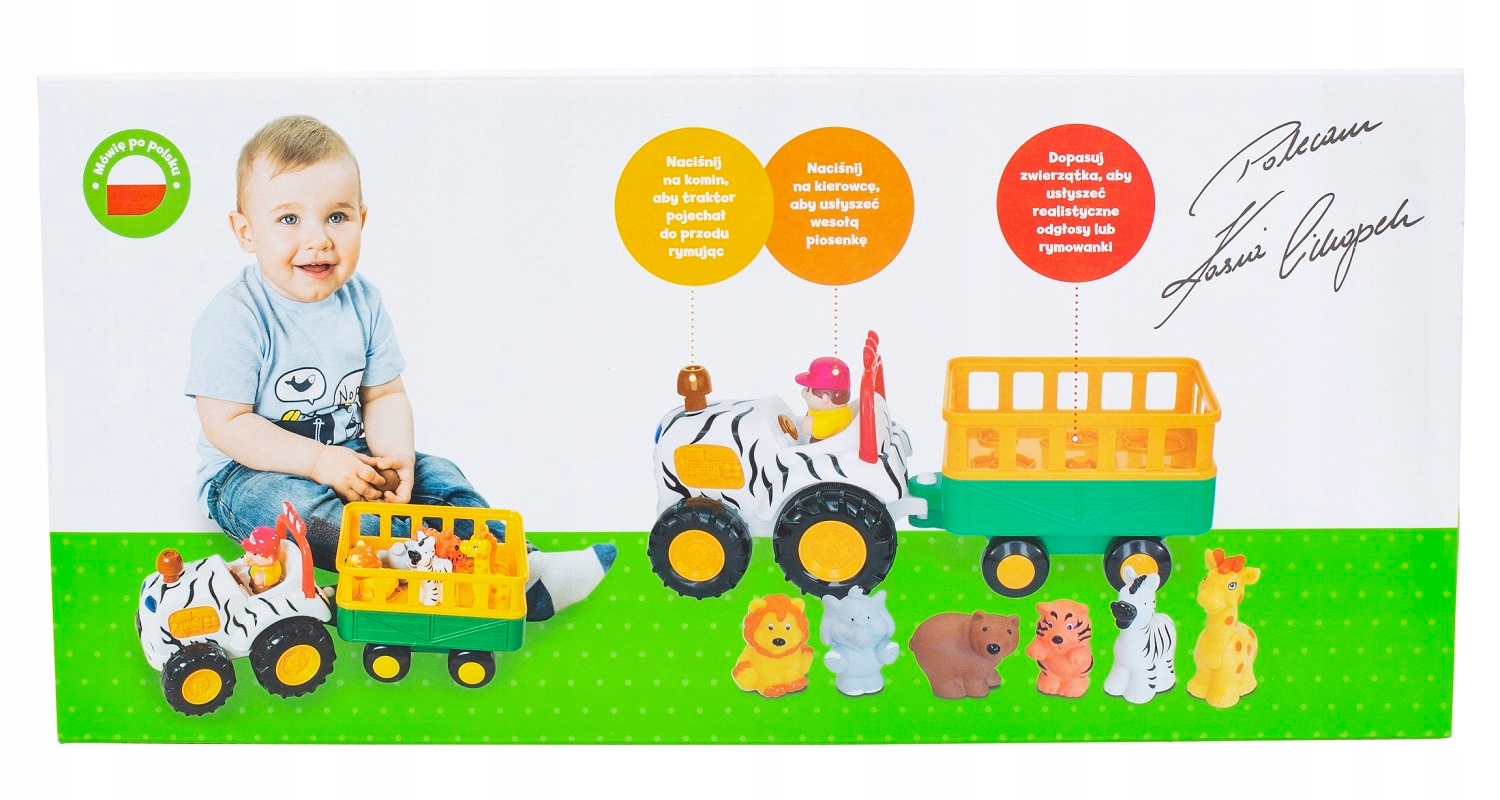 У красочного трактора есть сортировщик фигур и 6 животных в прицепе. Когда ваш малыш поместит животное в нужное место, он или она в качестве награды услышит реалистичный звук или стишок о нем. После нажатия на дымоход трактор под звук двигателя тронется вперед. Когда вы нажмете на водительское сиденье, ваш ребенок услышит песенку. Когда он нажимает на руль, раздается звуковой сигнал и мигают фары.