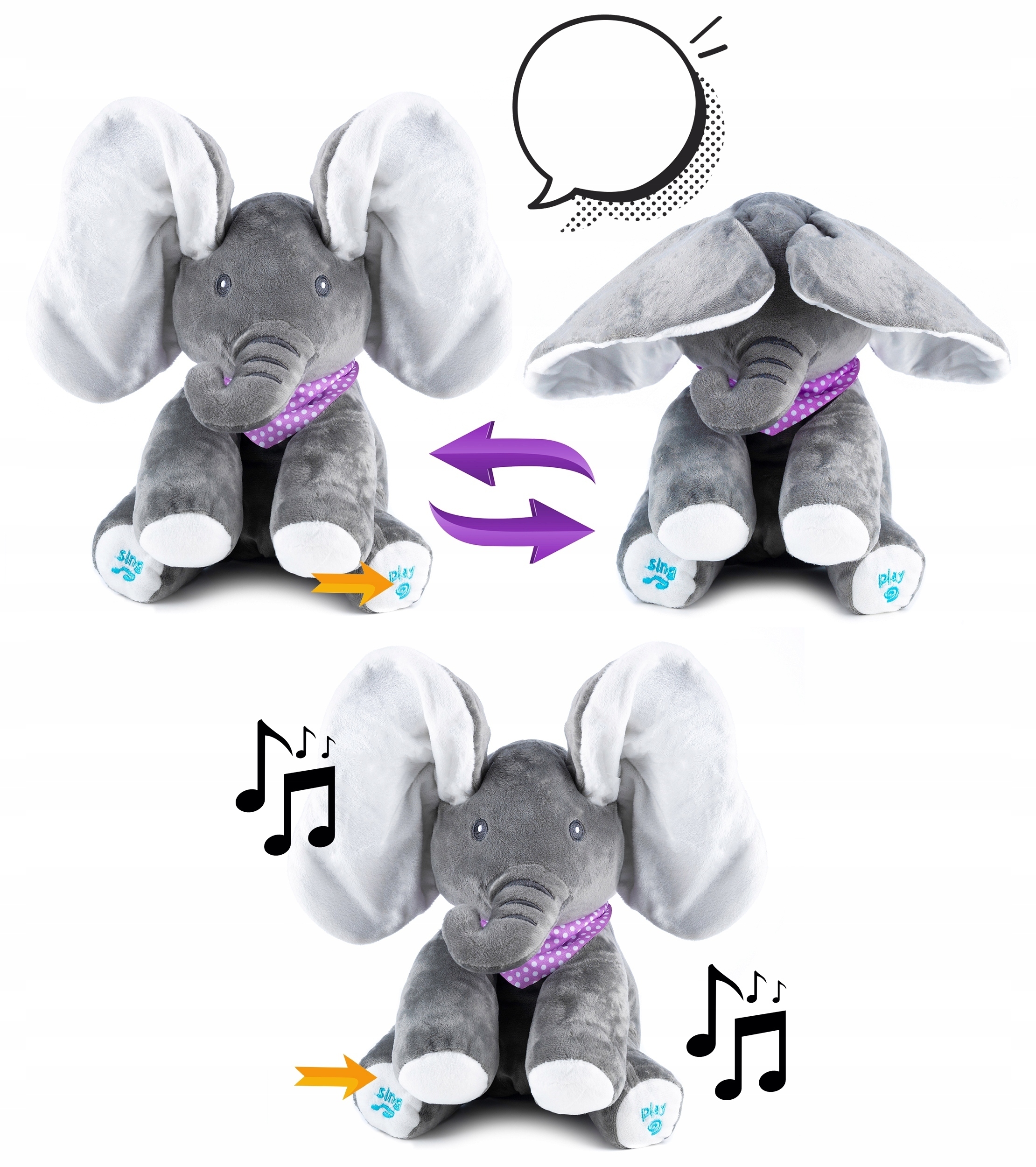 - 2 режима игры, активируемые кнопками, спрятанными в ногах слона: 1) прятки «Пика-ку» - слон закрывает глаза ушами и показывает, побуждая ребенка играть с помощью голосовых сообщений 2) веселое поет и движет ушами