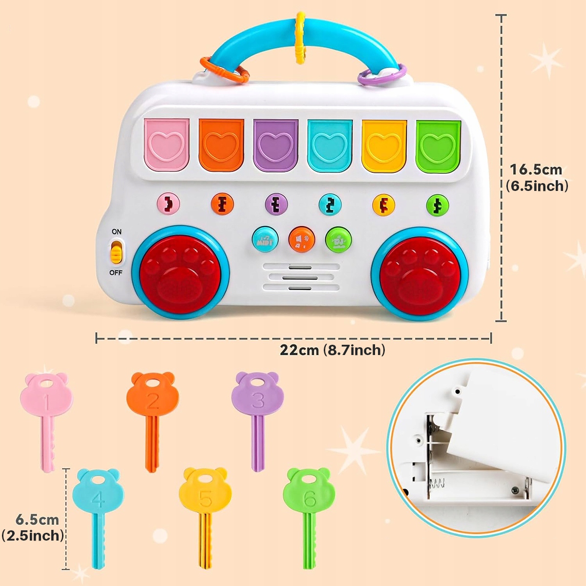 6 разных кнопок, позволяющих открывать дверцу, открывать для себя разных животных и развивать когнитивные навыки. Хлопните в ладоши, и красный барабан издаст свет и звуки. Игрушка имеет форму автобуса и имеет 3 кнопки для регулировки различных музыкальных режимов и громкости. (Музыка на английском языке, громкость регулируется.) Дети могут закрыть дверцу для питомца и поменять брелок для ключей, чтобы улучшить зрительно-моторную координацию.