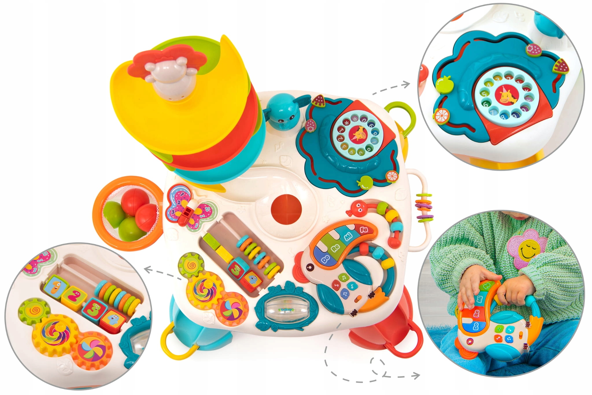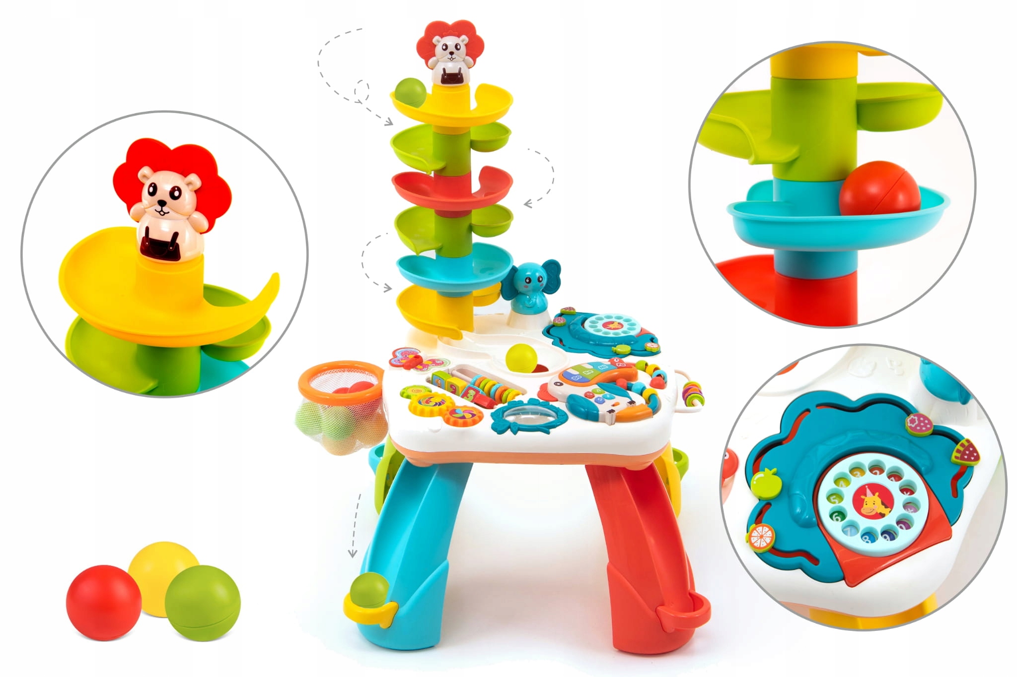 - Обучающая панель: 3 подвижные, съемные шестеренки пианино, горка для шариков, телефонный циферблат с цифрами, обручи с выдвижными блоками и съемная корзина для мячей.