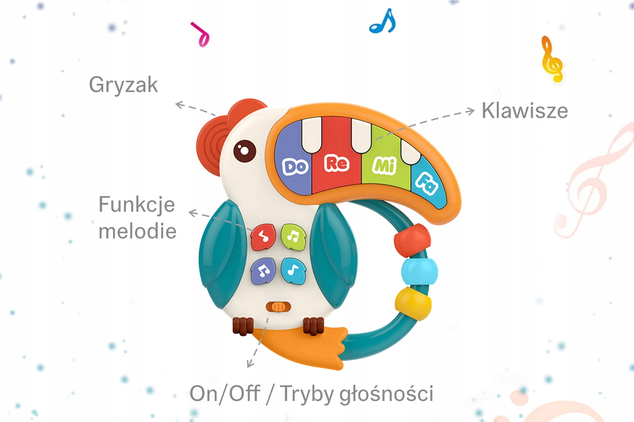 - Тукан играет на пианино: Его можно отсоединить, что делает его отдельной игрушкой, которую можно брать с собой.