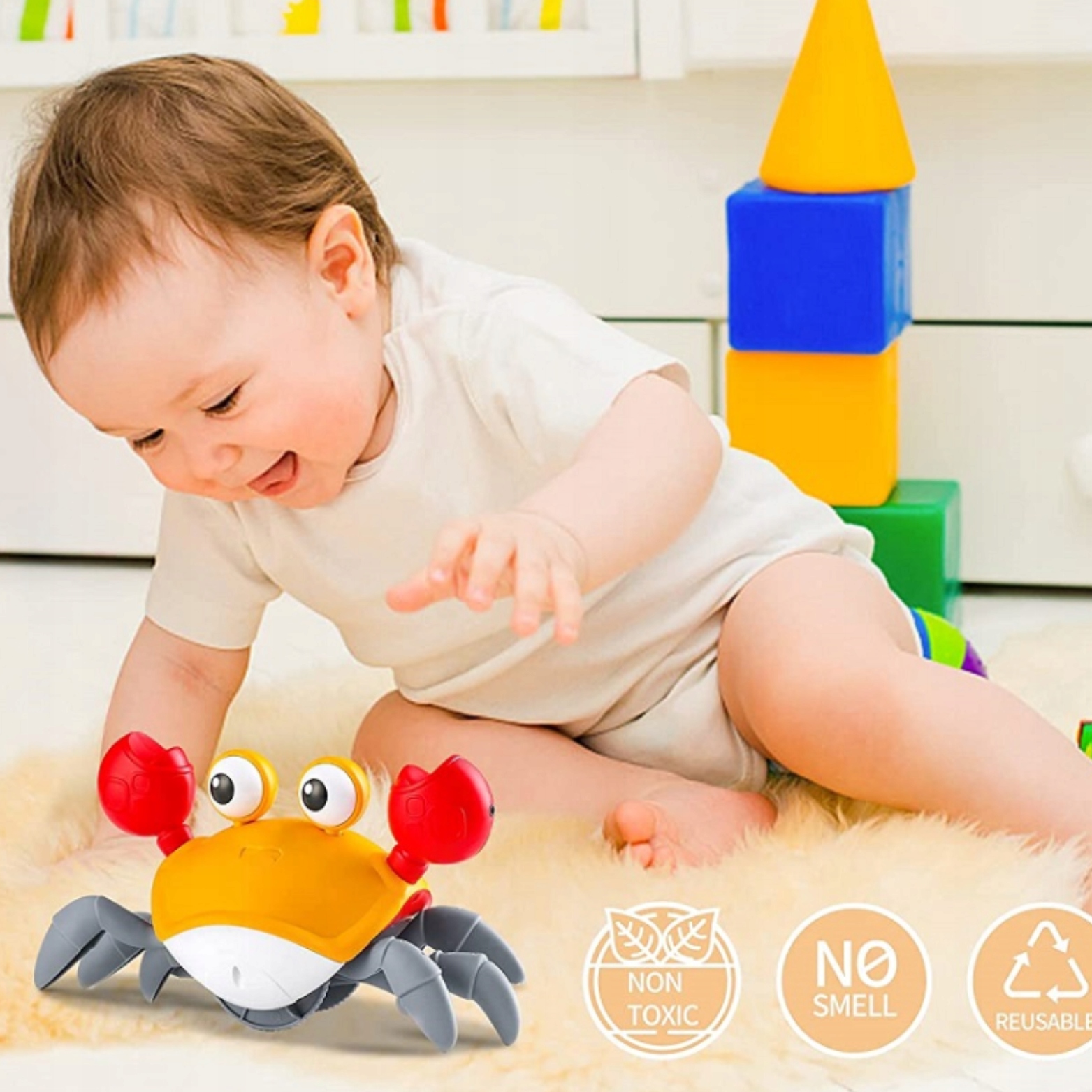 ➡️ Благодаря своему подвижному механизму краб постоянно движется, побуждая вашего ребенка двигаться и ловить его. Это отличный инструмент, который поддерживает развитие моторики маленького ребенка и побуждает его ползать и двигаться.