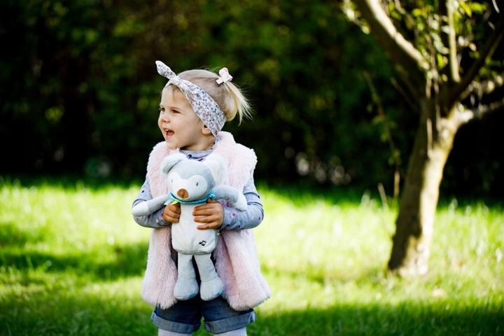 Механизм в животе также действует как музыкальная коробка с 10 мелодиями. Специально выбранный шум успокоит ребенка и способствует спокойному засну. Благодаря функции регулировки громкости мы можем адаптировать ее к потребностям нашего ребенка.
