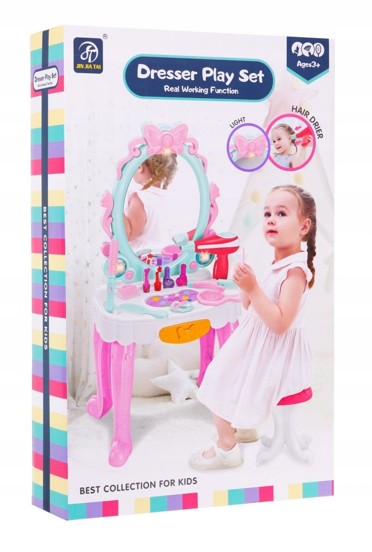 Описание Туалетный столик для маленькой принцессы Аксессуары Богато оборудованный туалетный столик с аксессуарами и табуреткой – предложение для маленьких принцесс от 3 лет. Игрушка имеет звуковые и световые эффекты. Питается от 5 батареек типа АА (в комплект не входят). Особенности набора: - подсветка сверху и по бокам туалетного столика, - три фоновых музыкальных произведения, - фен с потоком воздуха, - выдвижной ящик в туалетном столике. В комплект входит - туалетный столик с зеркалом, - табуретка, - 10 теней для век, - кисть для теней, - фен, - расческа, - кисть, - выпрямитель, - щипцы для завивки волос, - 2 заколки для волос, - 2 помады, - 2 лака Размеры - туалетный столик ок. 82 см х 40 см х 25 см, - табурет около 23 см х 26 см, - фен около 15 см х 18 см, - щипцы для завивки и выпрямитель высотой около 18,5 см, - расческа и щетка высотой около 14 см. , - упаковка примерно 60 см х 37,5 см х 12,5 см.