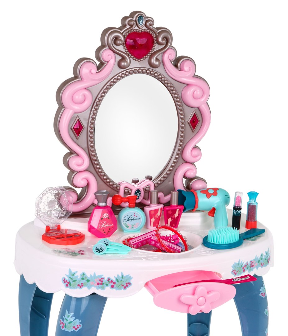 Интерактивный туалетный столик с зеркалом, табуреткой и аксессуарами для маленькой принцессы от трех лет. Игрушка имеет звуковую функцию (три мелодии) и световую функцию (сердце над зеркалом и два ромба по бокам зеркала). Игрушка питается от 2 батареек типа АА 1,5 В (в комплект не входят). Вся косметика, входящая в набор, является подделкой.