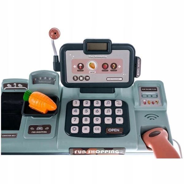 Также в игрушке есть считыватель кодов, как в реальном магазине. Поднеся считыватель к товару, после нажатия кнопки вы услышите, что это за товар, и на дисплее отобразится цена товара. Если вы отсканируете несколько товаров - калькулятор автоматически просуммирует сумму заказа. Чтобы закрыть аккаунт, нажмите кнопку =.