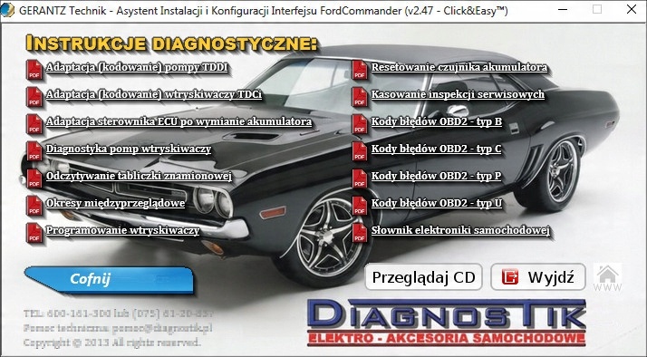 (инструкции, расположение диагностических разъемов на отдельных автомобилях, советы по диагностике, в том числе: удаление сервисных лампочек и лампочек проверки масла, коды ошибок.) и наша собственная программа: Помощник по установке и настройке устройств версия 2.47 с Click&Easy™