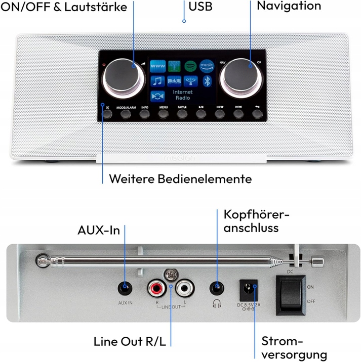 Встроенный USB-порт на передней панели идеально подходит для работы с вашей обширной музыкальной коллекцией. Сохраните все свои песни на одном USB-накопителе и воспроизводите файлы прямо на радио Medion. Легкодоступный разъем для наушников также практичен.