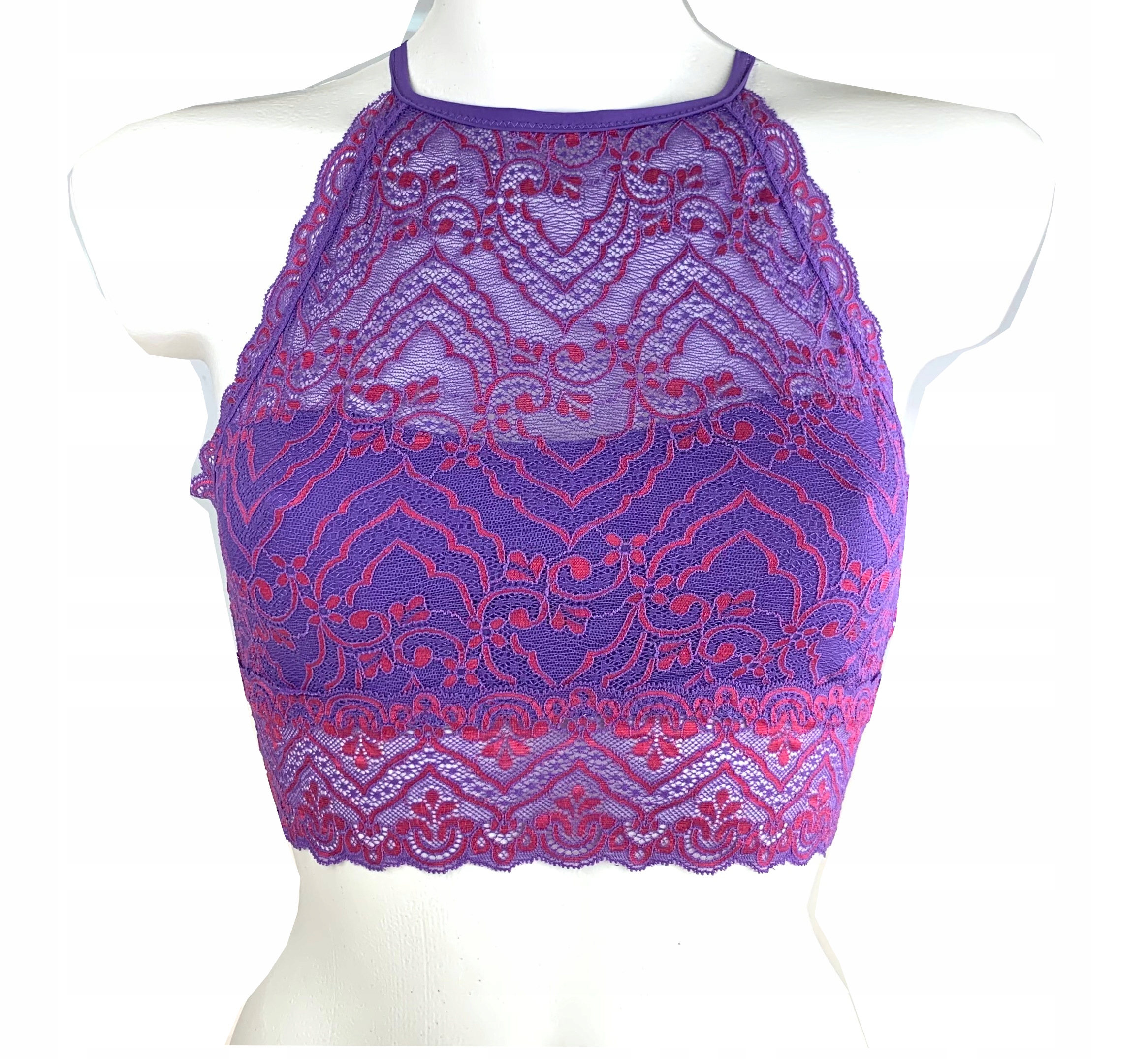- Топ из фиолетового кружева с контрастными розовыми деталями