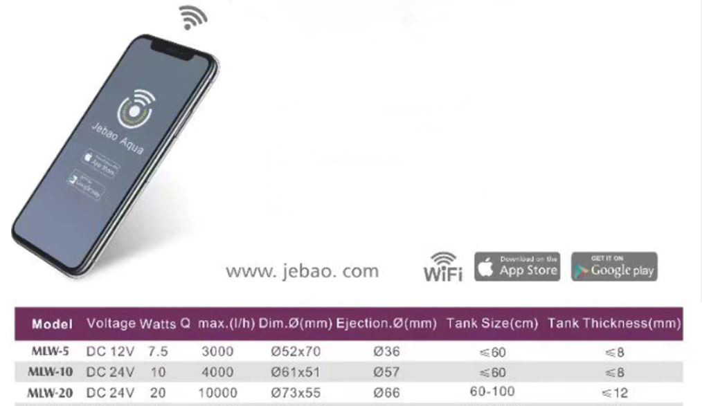 Насосы Jebao MLW (синусоидальный поток) с Wi-Fi и ЖК-дисплеем — это новейший насос от Jebao с очень широким распределенным нагнетанием, что приводит к практически полному отсутствию мертвых зон / мест, где нет потока. Эти проточные насосы поставляются с контроллером (внешним контроллером привода). Большим преимуществом этих новых насосов является то, что в насосе нет электронных компонентов, а почти все находится в контроллере. Эти насосы также оснащены синусоидальной технологией, которая обеспечивает очень тихую работу. Благодаря этому они также имеют увеличенный срок службы.