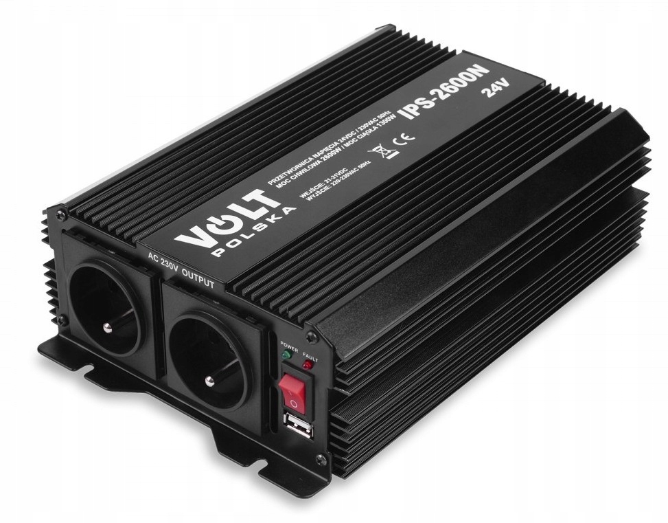 Электронный преобразователь напряжения IPS 2600N 24В 1 x USB предназначен для питания электроприборов, требующих переменного напряжения 230В от аккумуляторных батарей и автомобильных установок с постоянным напряжением 24В.