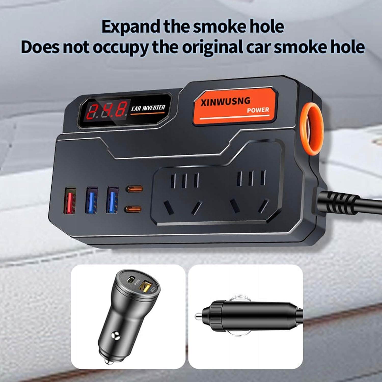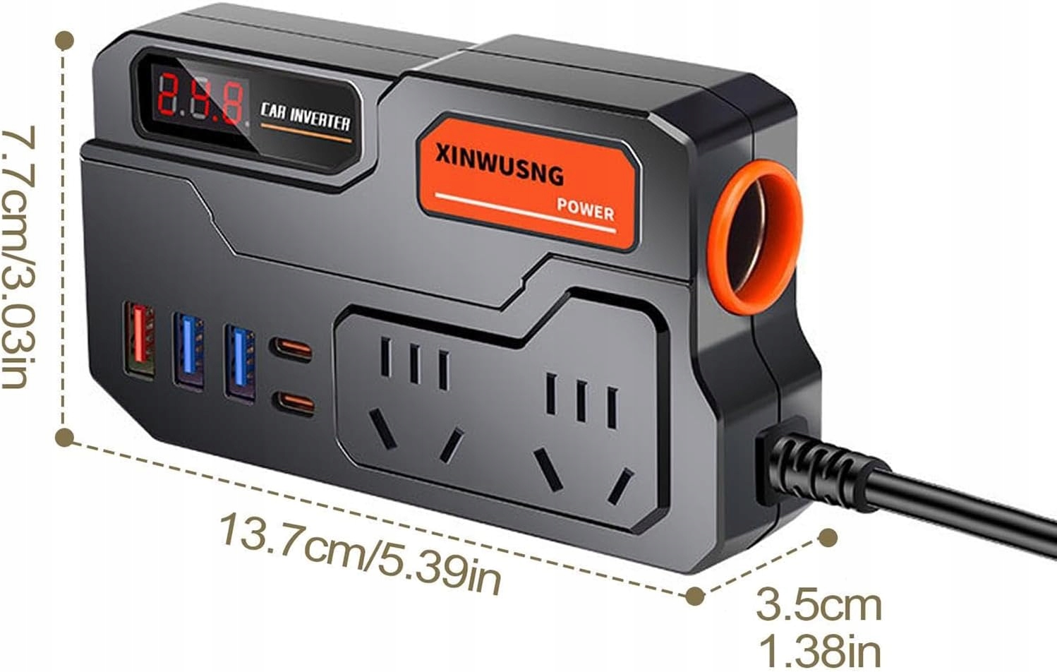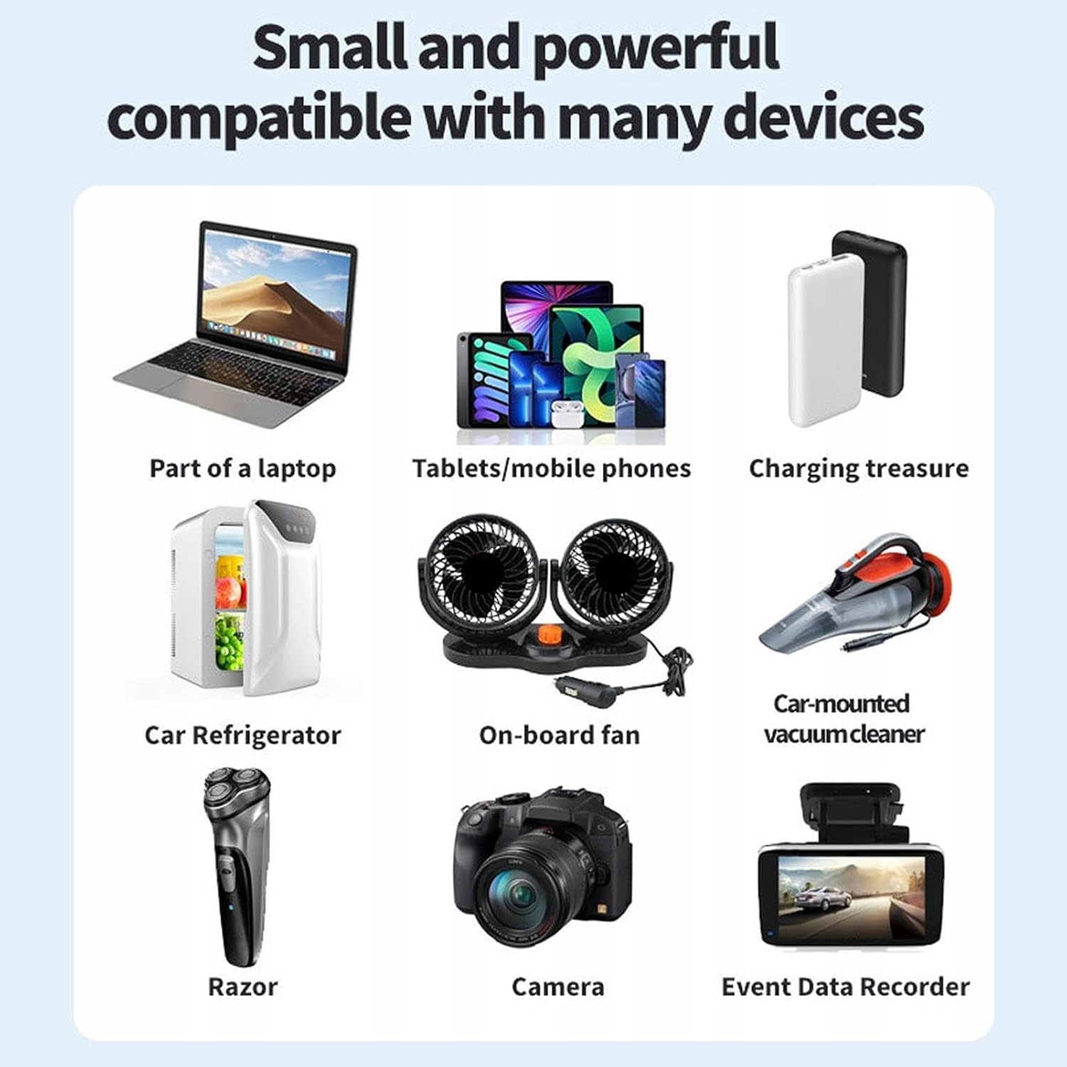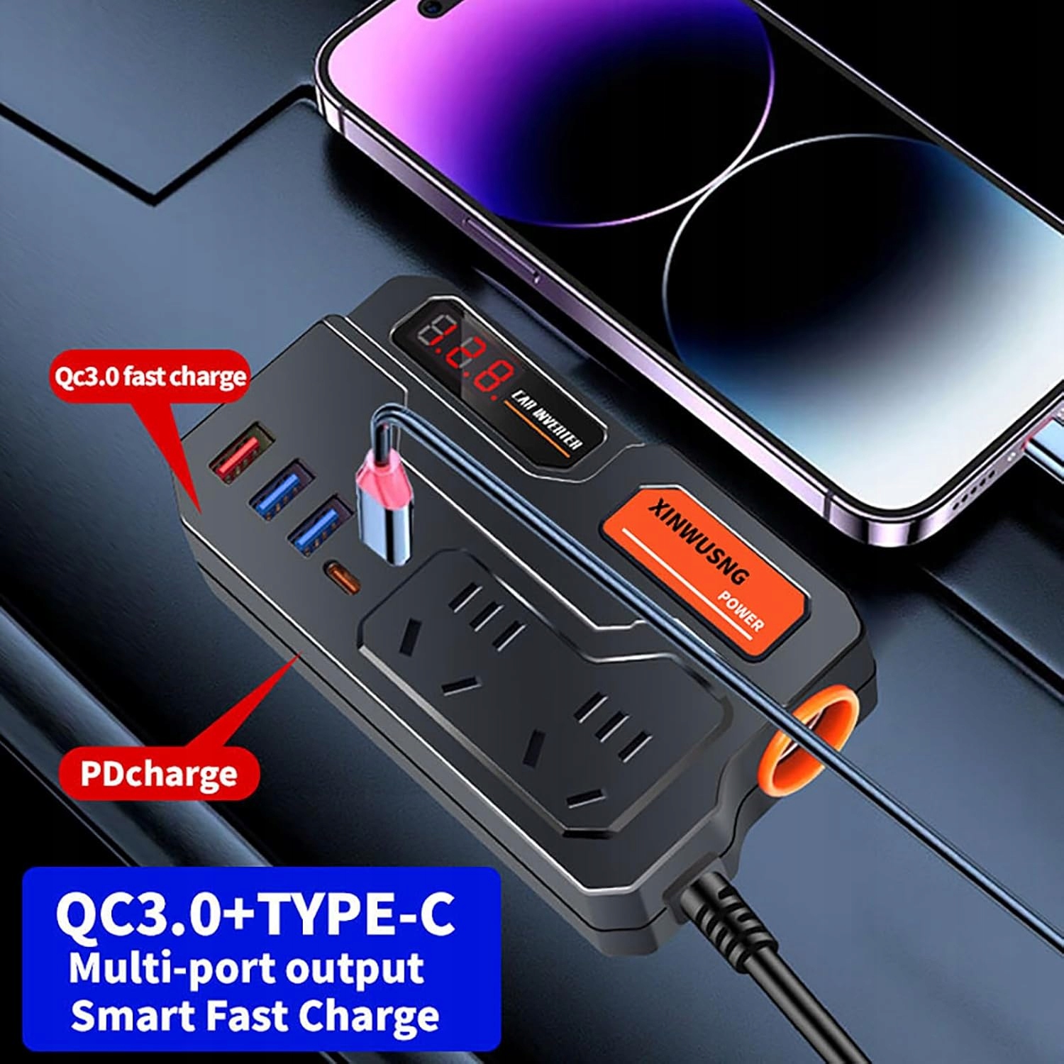 Совместное преобразование мощности в AC: инвертор автомобиля эффективно превращает 12 В постоянного тока автомобиля в мощность 110 В переменного тока, что позволяет заряжать или поставлять устройства, такие как ноутбуки, телефоны, планшеты и небольшие устройства, когда вы находитесь в поездке.