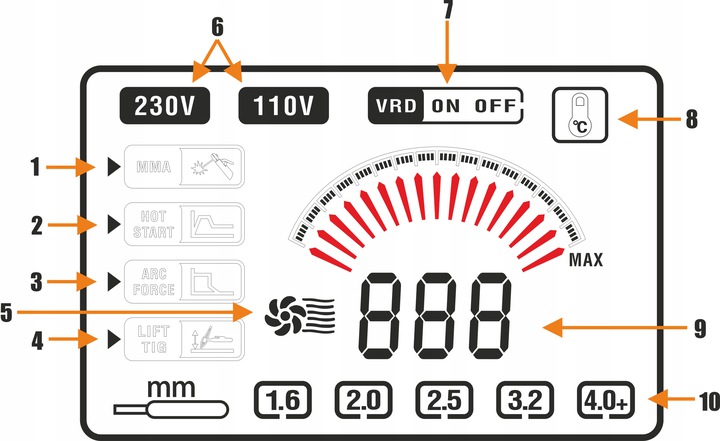 Приведенный выше индикатор информирует о рекомендуемой толщине электрода для данного сварочного тока. Это подсказка для начинающих пользователей: после установки тока, соответствующего выбранному электроду, рекомендуется корректировка после испытаний на материале.