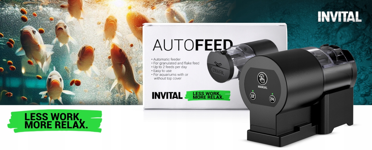 Автоматическая кормушка INVITAL ✨ – это еще один шаг к полной автоматизации аквариума. Благодаря автомату кормления вы можете забыть об обязанности кормить малыша каждый день – предустановленные программы обеспечивают доставку еды с двумя интервалами 12/24 часа. Большой резервуар (100 мл) с ручным контролем дозы можно использовать как для гранулированных, так и для хлопьев.