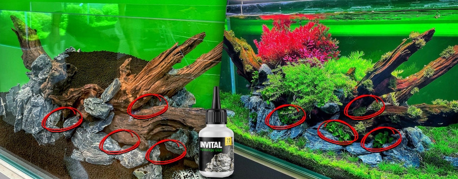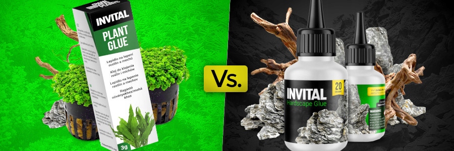 INVITAL Plant Glue – клей, предназначенный для приклеивания растений, а клей INVITAL HardScape – для приклеивания украшений. Разница в том, что клей INVITAL Plant имеет меньшую вязкость (медленнотекучий), скорее гелеобразный, имеет гораздо более слабую связь, предназначен для склеивания «живых» материалов (растений) и может использоваться под водой, а клей INVITAL HardScape не может можно использовать под водой (т.е. он не пригоден для склеивания тяжелых предметов типа камней и корней, у него более высокая вязкость (капает), он не предназначен для склеивания «живых материалов» и имеет гораздо более прочную связь💪.