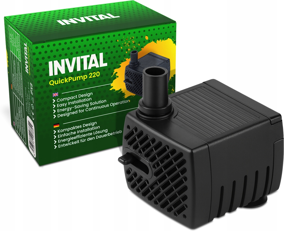 INVITAL QuickPump 220 — универсальный насос с регулировкой производительности. Он имеет множество применений – его можно использовать в водных украшениях или каскадах, а также для питания аквариумных фильтров и откачивания воды при обслуживании аквариума. Благодаря ручному управлению потоком его можно легко адаптировать к конкретным условиям применения и, как и другие насосы INVITAL, он предлагает отличное соотношение цены и качества.