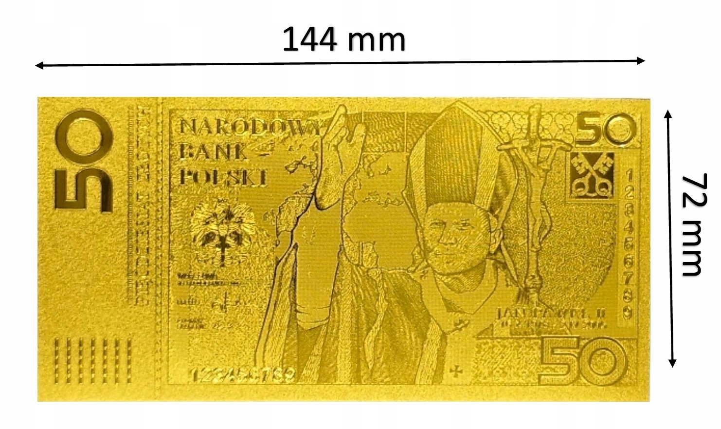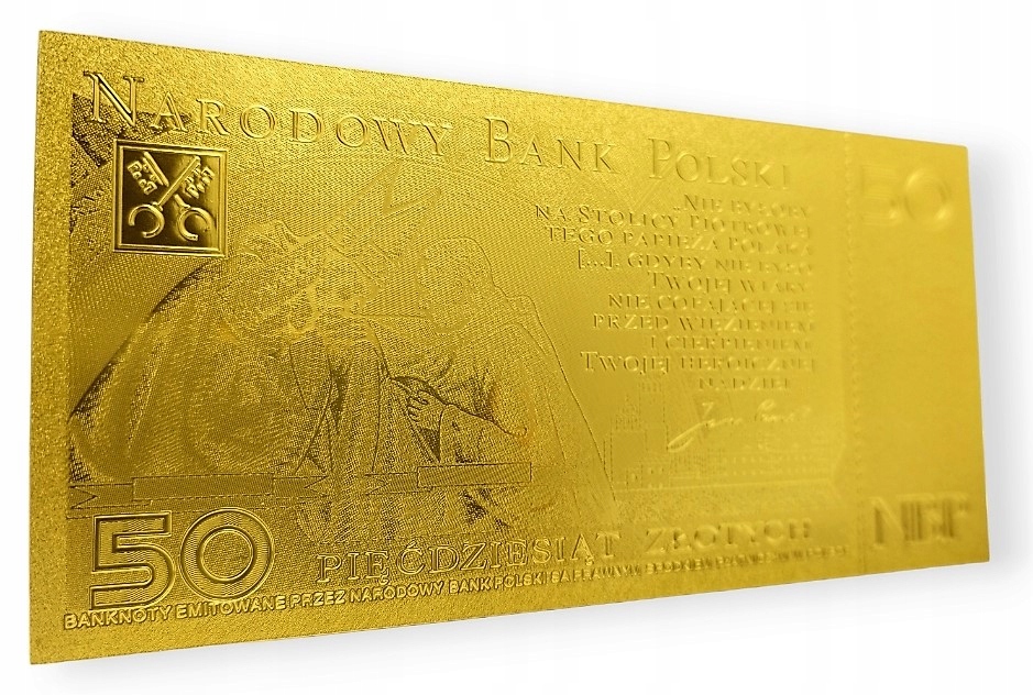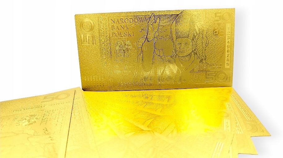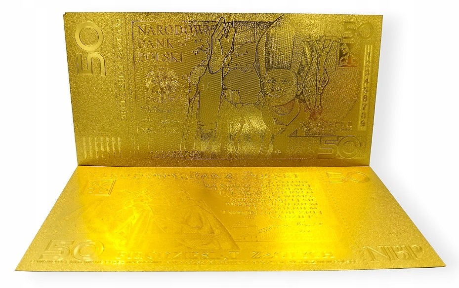 Точная копия первой польской коллекционной банкноты из ПВХ и покрыт фольгой золотого цвета.