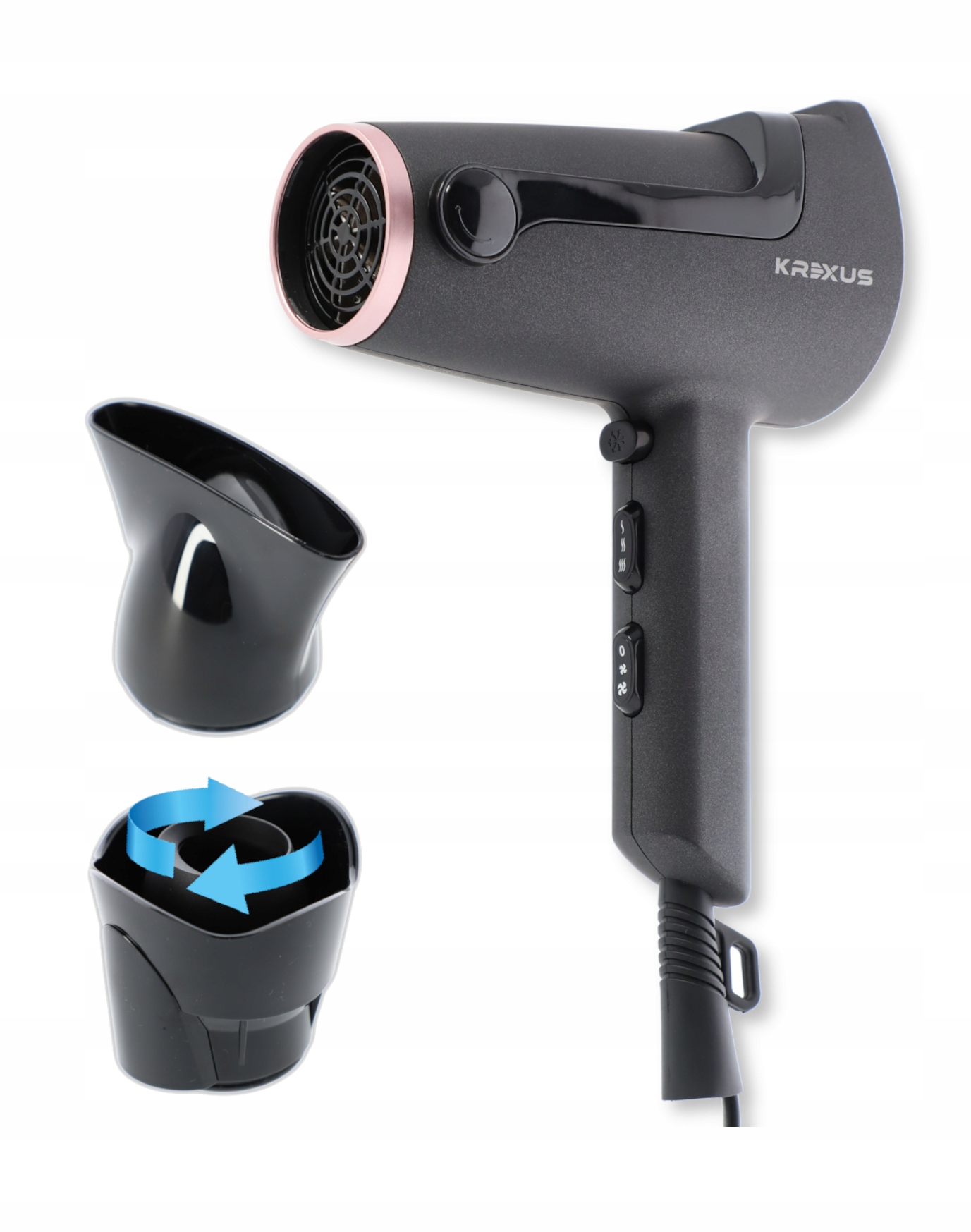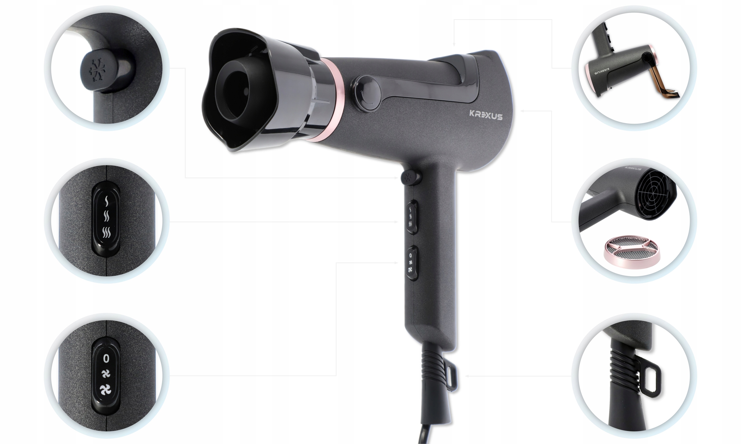 Регулировка температуры и скорости воздуха позволяет вам выбрать подходящие параметры в соответствии с состоянием ваших волос и вашими потребностями. Устройство KREXUS предлагает 2 уровня скорости обдува и 3 уровня регулировки температуры, чтобы вы могли эффективно и безопасно сушить и укладывать волосы. Переключатели перемещаются очень легко и легко доступны, поэтому вы можете быстро изменить настройки, не используя вторую руку, даже во время процедуры. Оба регулятора работают независимо, что позволяет комбинировать настройки, например, сильный поток воздуха при не очень высокой температуре. Это считается самым здоровым решением, чтобы не повредить и не пересушить волосы.