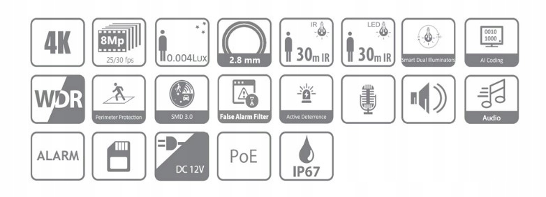 Dahua TiOC, также называемая камерами Dahua 3-в-1, представляет собой современное поколение камер наблюдения, входящих в серию Dahua WizSense. Устройства TiOC сочетают в себе 3 инновационные технологии: Dahua Full-Color (цветное изображение 24/7), функции искусственного интеллекта AI и активное аудиовизуальное сдерживание. Камеры Dahua TiOC обеспечивают еще более точную идентификацию обнаруженной угрозы с одновременной возможностью сдерживания с помощью световых и звуковых сигналов