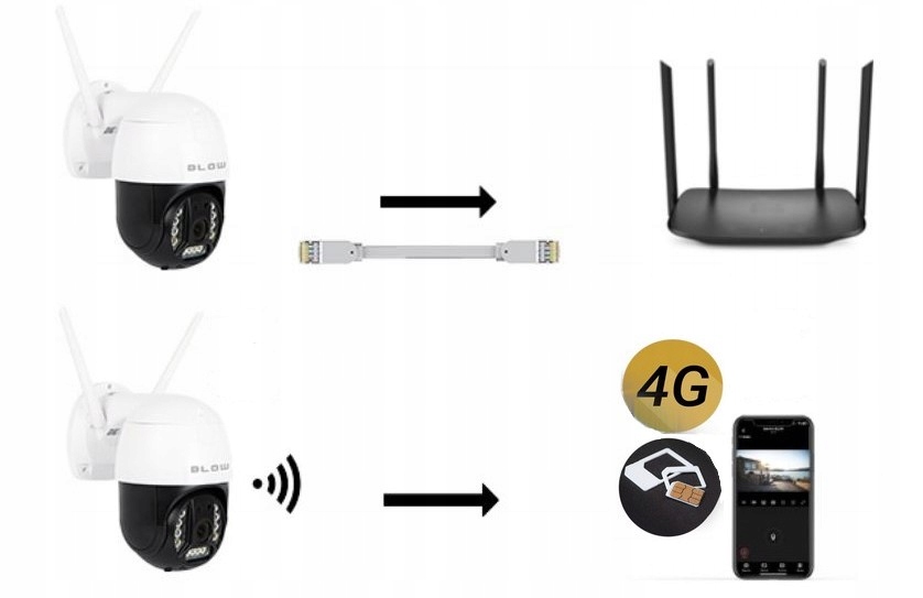 Новая интеллектуальная IP -камера PTZ Blow H343 4G LTE, 4G Антенна 230 В питания сетевой питания с адаптером WAN сетевой кабель/монтажный кабель LAN с винтами для винта на стене. Защита от подключения кабеля, Руководство пользователя в польском DC 12V / 2A с DS 2,1 / 5,5 мм заглушка в наборе с устройством