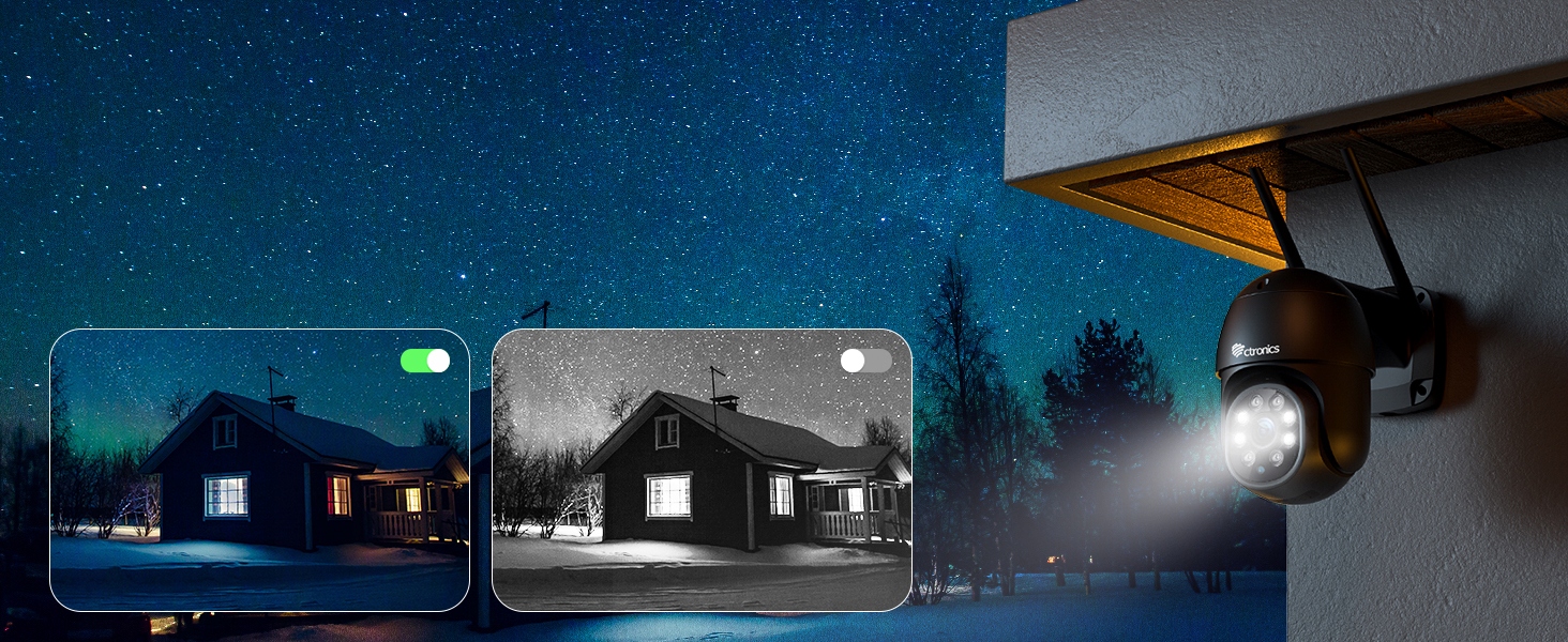 - Внешняя камера Ctronics обеспечивает 2K 4MP (2560X1440P) более четкие и плавные изображения и видео по сравнению с ними с камерами 720p. Благодаря передовой технологии цветного ночного видения он может видеть на расстоянии до 30 метров даже в темную ночь. В автоматическом режиме встроенный налобный фонарь автоматически включается при обнаружении человека, что обеспечивает большую экономию энергии и более длительный период работы. С этой уличной камерой Ptz преступлениям негде спрятаться.