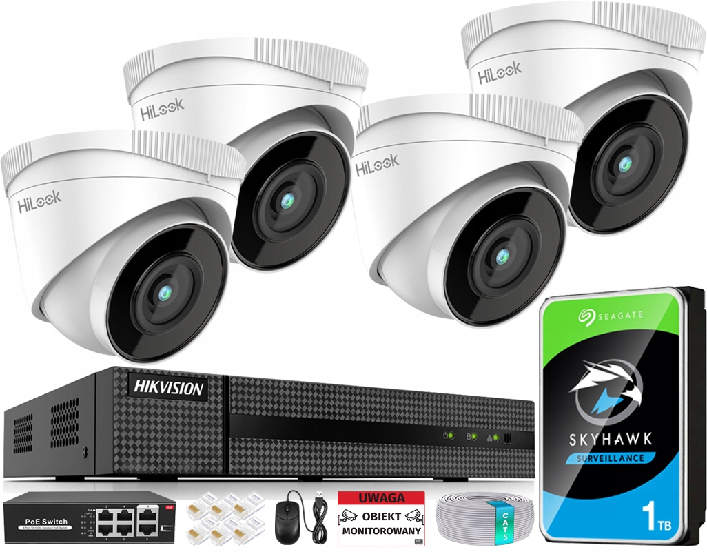 4 уличные IP-камеры HiLook по 5 мегапикселей | 1x 4-канальный рекордер Hikvision | 1 диск емкостью 1 ТБ | Кабели и монтажные аксессуары
