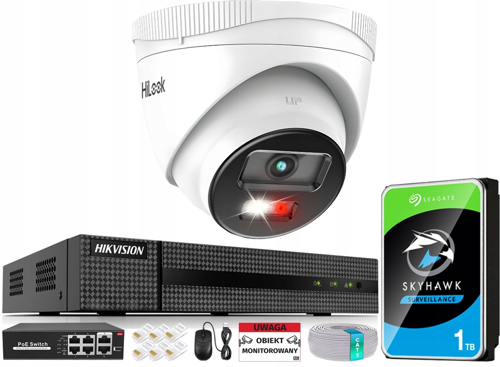 1 уличная IP-камера HiLook 4 МП | 1x 4-канальный рекордер Hikvision | 1 диск емкостью 1 ТБ | Кабели и монтажные аксессуары