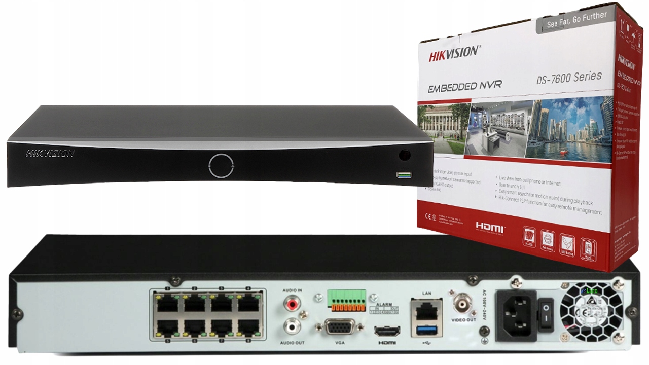 Рекордер позволяет записывать изображения с IP камеры с разрешением до 12 Мп. Он имеет встроенный 8-портовый коммутатор PoE, обеспечивающий прямое подключение и питание IP-камер. Независимые выходы HDMI (разрешение до 4K) и VGA (разрешение до 1080p) позволяют подключить два монитора. Вид на каждом выходе можно настроить независимо, задать различные разделения окон и вывести изображение с любой камеры на каждое из них. 2 порта SATA позволяют подключать жесткие диски емкостью до 10 ТБ каждый. В случае переполнения памяти запускается автоматическая перезапись, чтобы предотвратить потерю последних данных. Встроенные порты USB позволяют подключать флэш-накопитель или внешний диск и копировать определенные фрагменты на внешние носители данных.