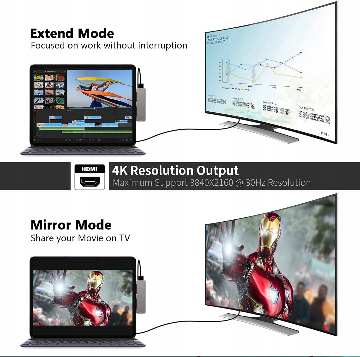 Несколько портов для iPad: концентратор USB-C 7-в-1, порт HDMI, порт USB 3.0, устройство чтения карт SD/TF, аудиопорт 3,5 мм и порт USB C PD для дублирования и расширения экрана, передачи фотографий, видео, данные, подключайте клавиатуру или накопитель, слушайте и синхронизируйте.