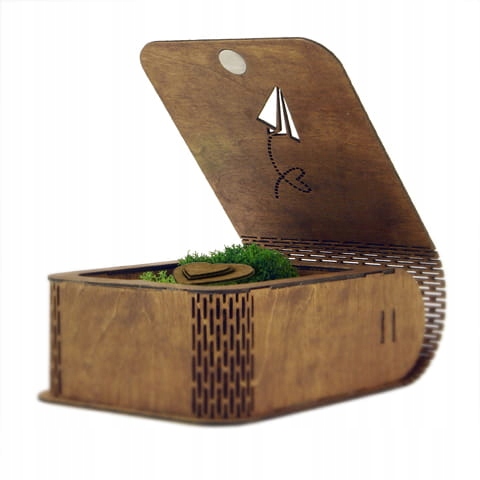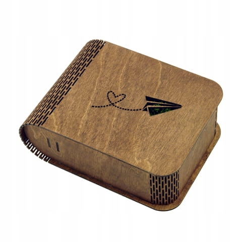 Шкатулка полностью изготовлена из березы, отшлифована, а затем покрашена в цвет рустикального дуба. Поверхность была дополнительно защищена натуральным маслом. Благодаря специальным вырезам на корешке и магнитам коробка удобна и практична в использовании. Все это дополняет стильное окно, выполненное с помощью лазерной технологии.