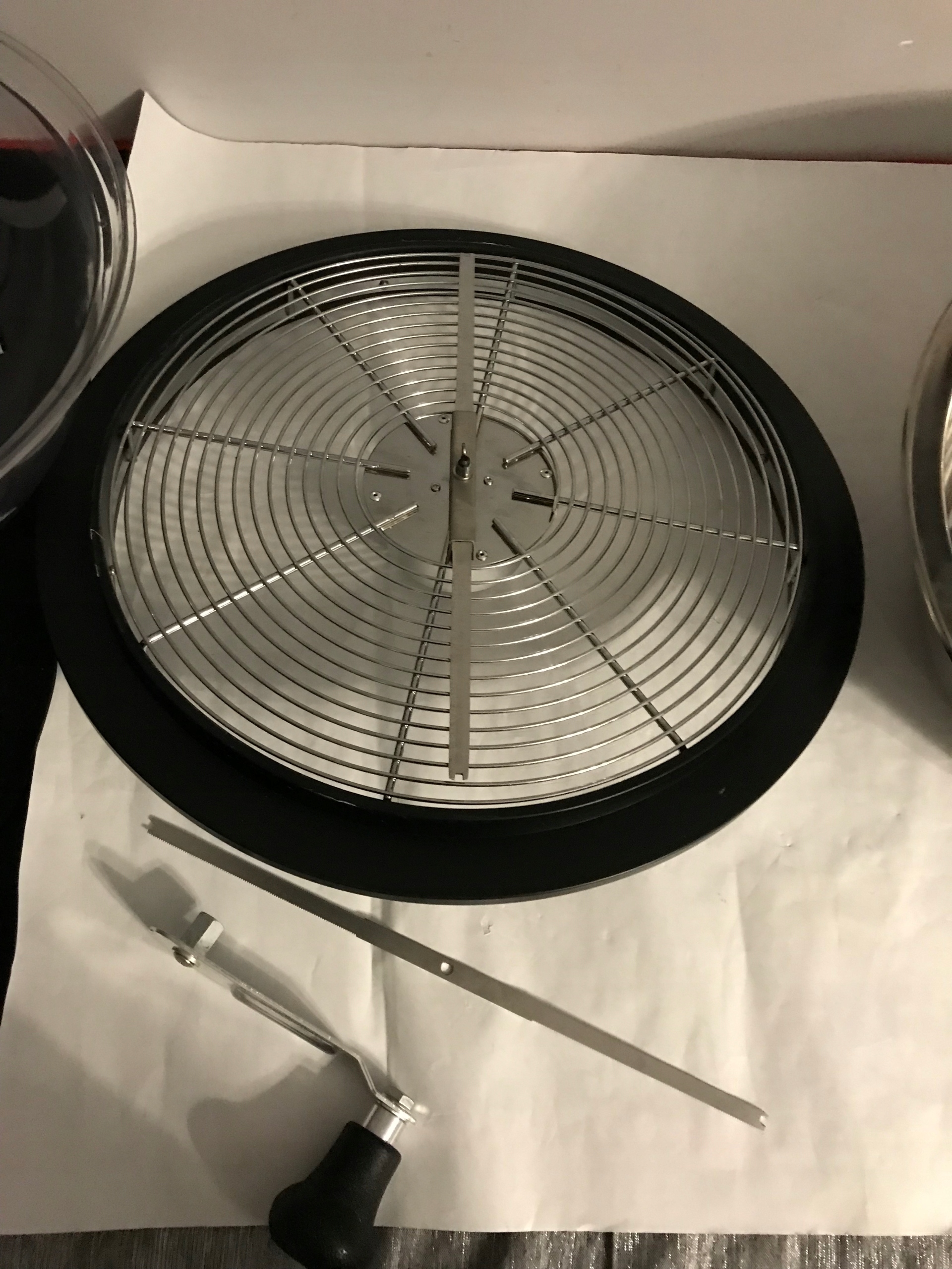 - Содержимое упаковки: прозрачная акриловая крышка, 24 черных резиновых ленты и черное резиновое кольцо, 1 силиконовая нескользящая накладка, сетка и чаша из нержавеющей стали (16 дюймов), 4 резиновые колонки, 1 шт. зубчатое лезвие для сухой обрезки, 1 прямое лезвие для влажной обрезки,