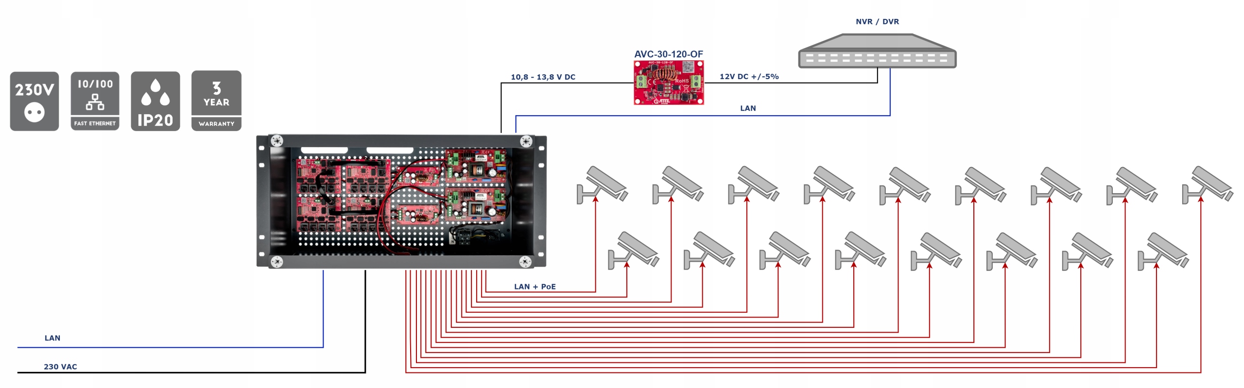 Буфер, установленный до 17 IP-камер, в корпусе Rack Abox-R5U0 (2x Aku 18ah), 144W источника питания (2x 72 Вт), Poe 18-й переключатель порта 10/100 Мбит/с (17xpoe + 1xuplink), электронные изгибы, режим длительного диапазона, Ipups-17-15U00), электронные изгибы, большие расстояние, юпульс-17-11-R5U00), электронные изгибы, режим длительного расстояния. Функции: