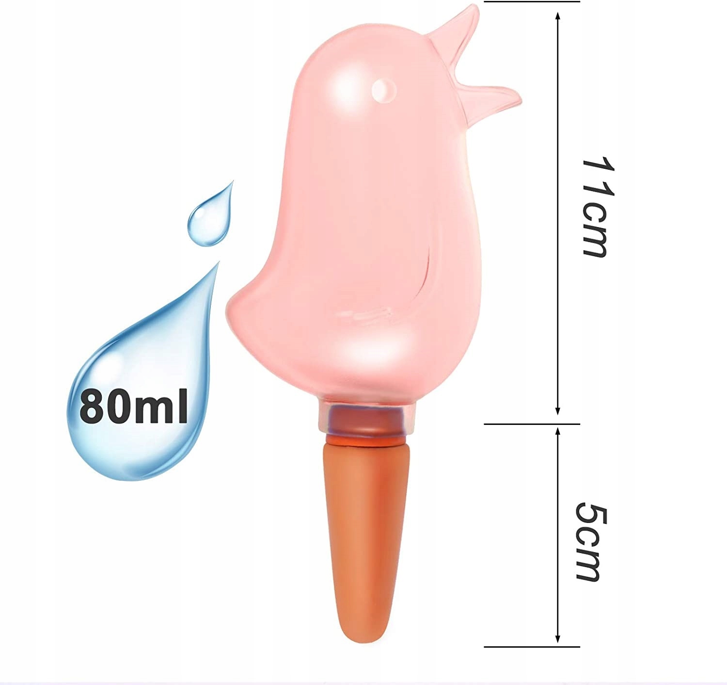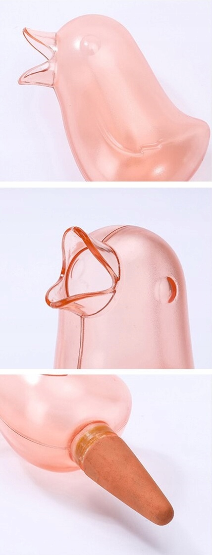 - Простота использования - достаточно налить воду через отверстие в клюве и воткнуть ирригатор в почву в горшке (в зависимости от цветка ирригатор может работать до 7 дней).