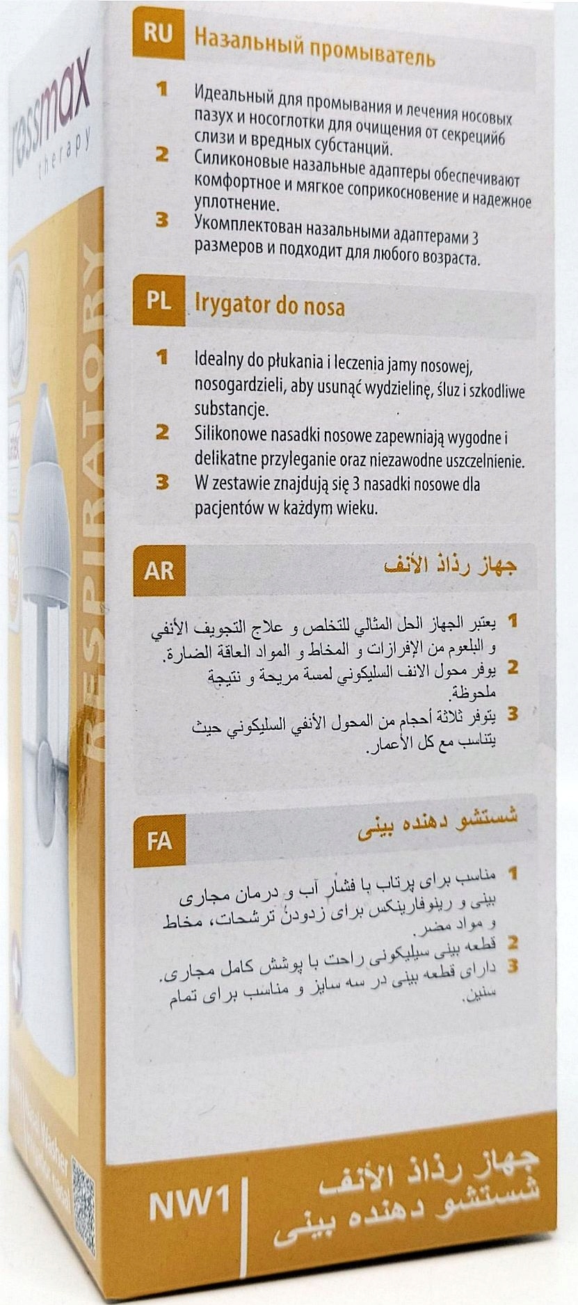 Ирригатор для носа Rossmax NW1 предназначен для увлажнения и очищения полости носа и носоглотки. Удаляет выделения, слизь и насморк с помощью солевого раствора или лечебных аэрозольных терапевтических растворов.