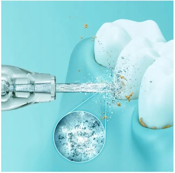 Мощная струя воды с использованием ультразвуковой технологии позволяет удалить остатки пищи, прилипшие к поверхности зубов.