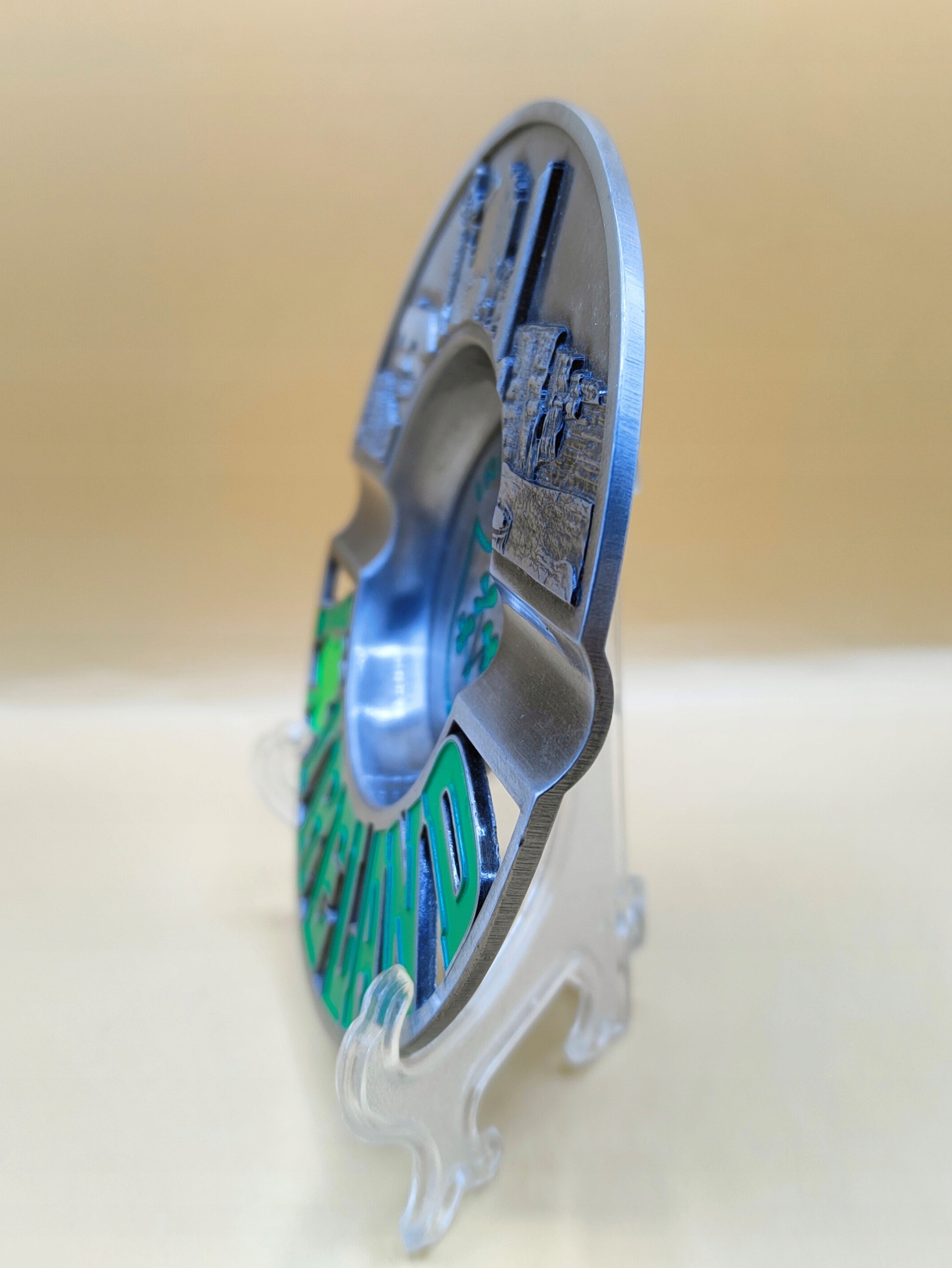 Металл/возможно алюминий или цинк. Диаметр 13см, толщина 1,3см, вес 170 грамм. В жизни вещь выглядит так же красиво, как и на фотографиях. Предмет старый, в очень хорошем состоянии, коллекционный.