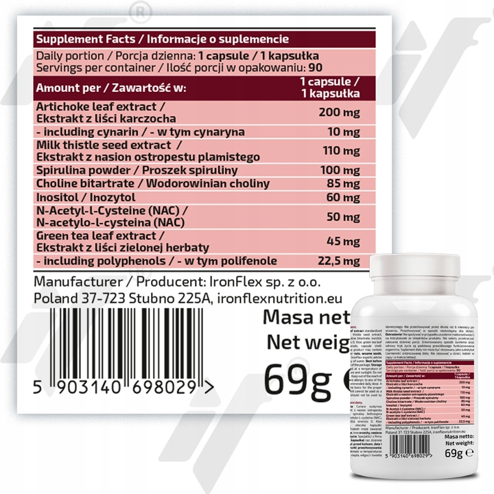 ИНГРЕДИЕНТЫ: Экстракт листьев артишока Cynara scolymus стандартизированный до 5 % цинарин, экстракт семян расторопши расторопши пятнистой, порошок спирулины Arthrospira Platensis, битартрат холина, инозитол, N-ацетил-L-цистеин (NAC), экстракт листьев зеленого чая Camellia sinensis O. Ktze, стандартизированный до 50 % полифенолов, оболочка капсулы: гидроксипропилметилцеллюлоза (HPMC).