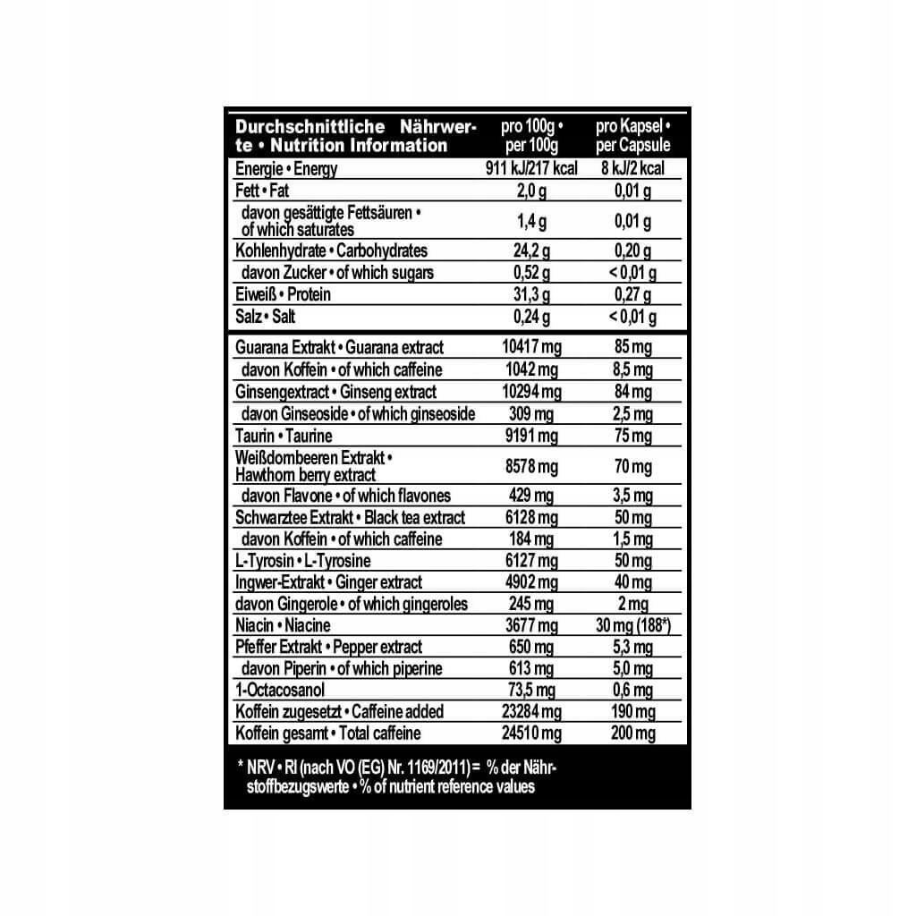 очень сильная предварительная подготовка. Это обеспечивает идеальное внимание во время обучения. подготовка поддерживает эффективность и эффективность обучения, предотвращает катаболическую фазу и ускоряет регенерацию мышц после физического нагрузки. Экстракт гуарана более эффективно и дольше, чем кофе, повышает бдительность, концентрации, способность логически мыслить и помнить.