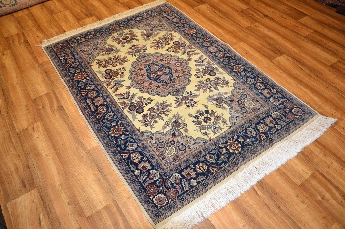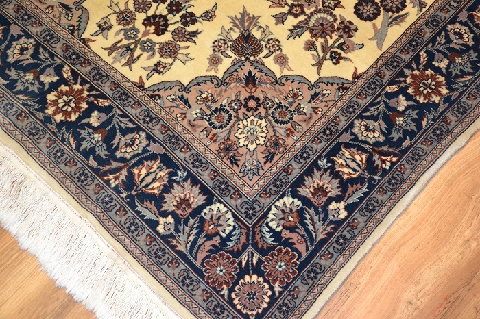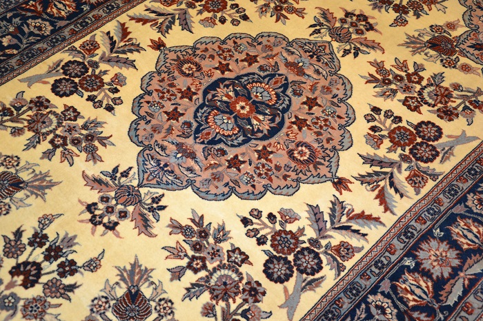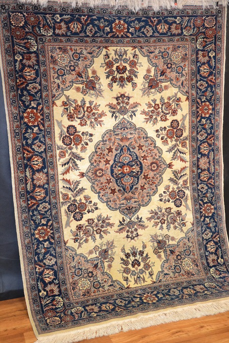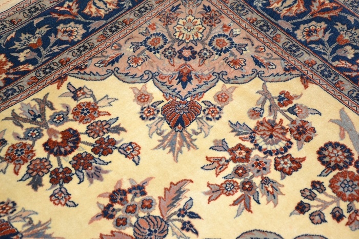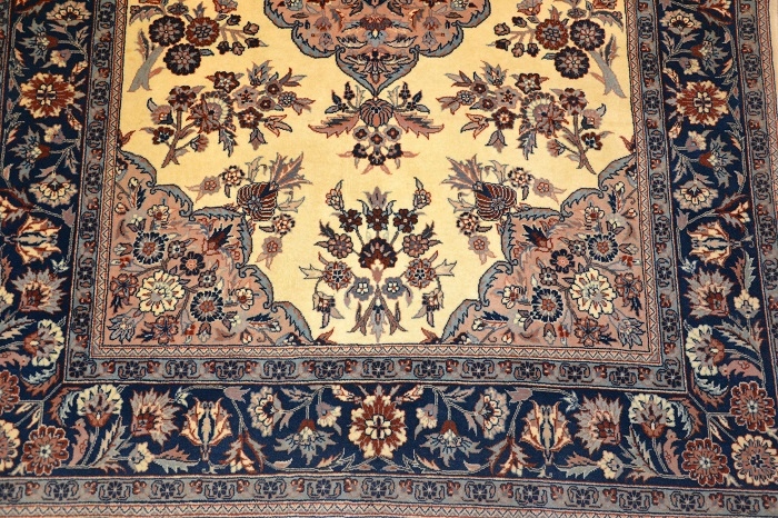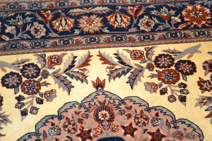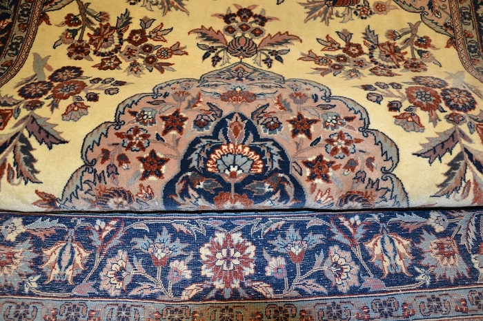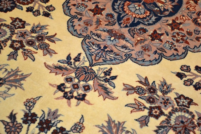 Высококлассный и исключительно красивый, оригинальный персидский ковер ISFAHAN - сотканный вручную и изготовленный из кашемировой шерсти высочайшего качества, подтвержденный сертификатом качества и происхождения, с плотно скроенным блестящим ворсом. Восточный дизайн (внушительный медальон в окружении прекрасных цветочных композиций) и гармонично контрастирующие цвета делают его в разложенном виде необыкновенно красивым и достойным.