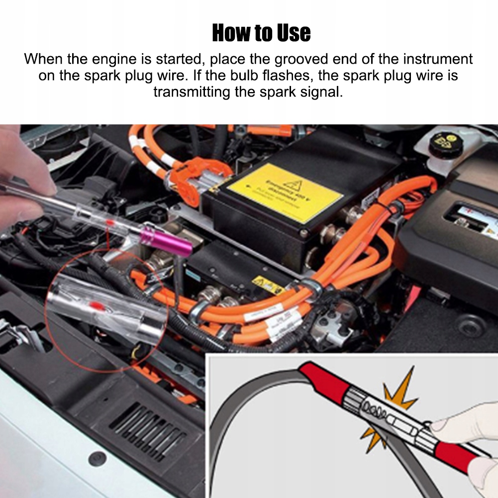 Этот продукт можно использовать для проверки свечей зажигания, катушек и распределителей зажигания в двух местах: электронной системе зажигания и автоматическом выключателе. Рифленый конец увеличивает площадь контакта провода с прибором, а лампочка повышенной яркости облегчает наблюдение за результатами измерений.