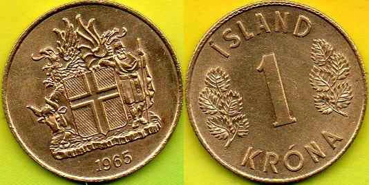 ИСЛАНДИЯ 1 КРОНА 1965 ГОДА