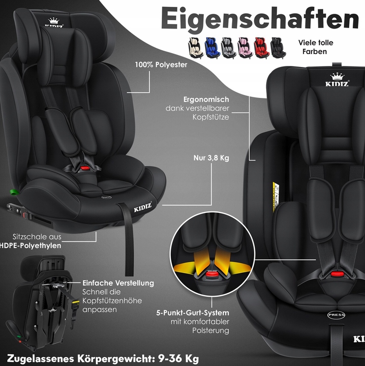 Безопасность является самым высоким приоритетом при разработке этого детского автомобильного сиденья. 5-точечная система ремней обеспечивает оптимальную защиту детей во время вождения. Кроме того, сиденье kidiz имеет оболочку из автомобильного сиденья, изготовленного из полиэтилена HDPE , что обеспечивает дополнительную защиту в случае боковых ударов. Интегрированный адаптер isofix обеспечивает еще более безопасное монтаж в транспортном средстве, а верхний ремешок обеспечивает дополнительную стабильность