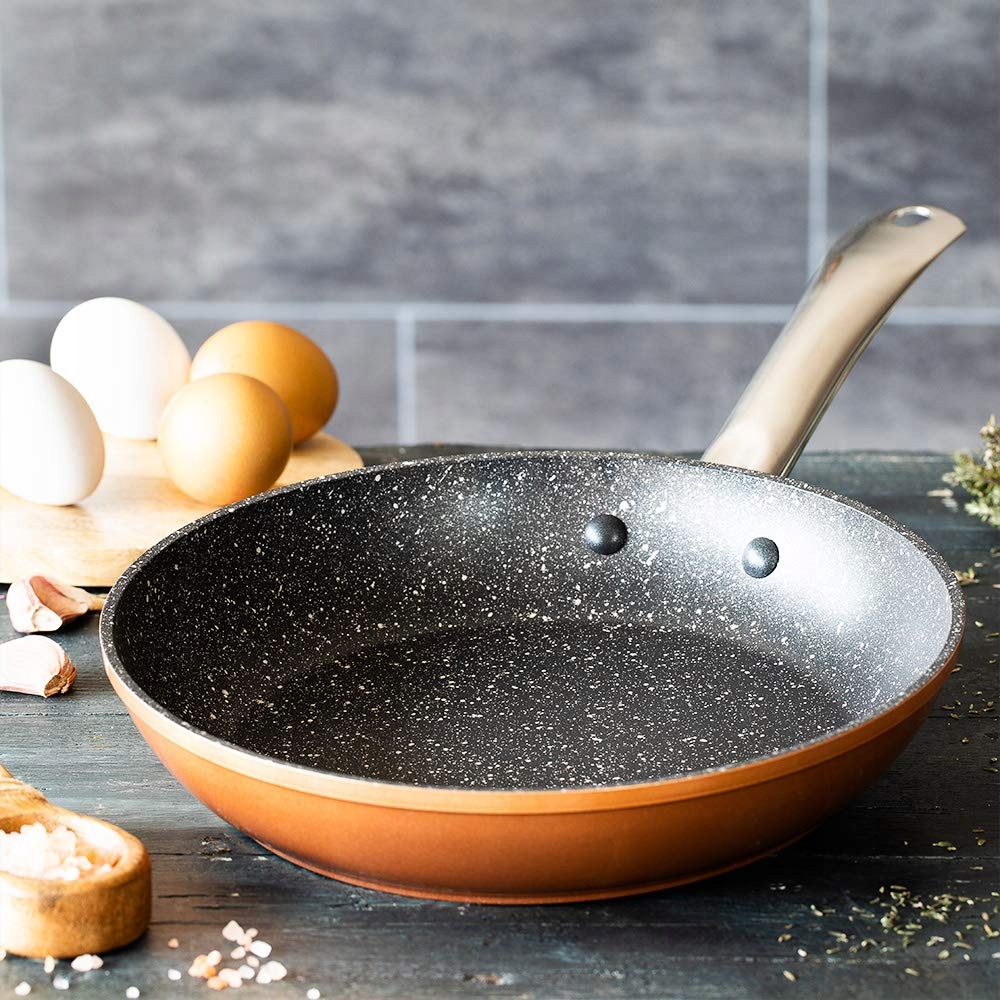 - Изготовлен из высококачественного кованого алюминия толщиной 4 мм. Этот набор сковород с внешним эффектом под медь равномерно распределяет тепло.