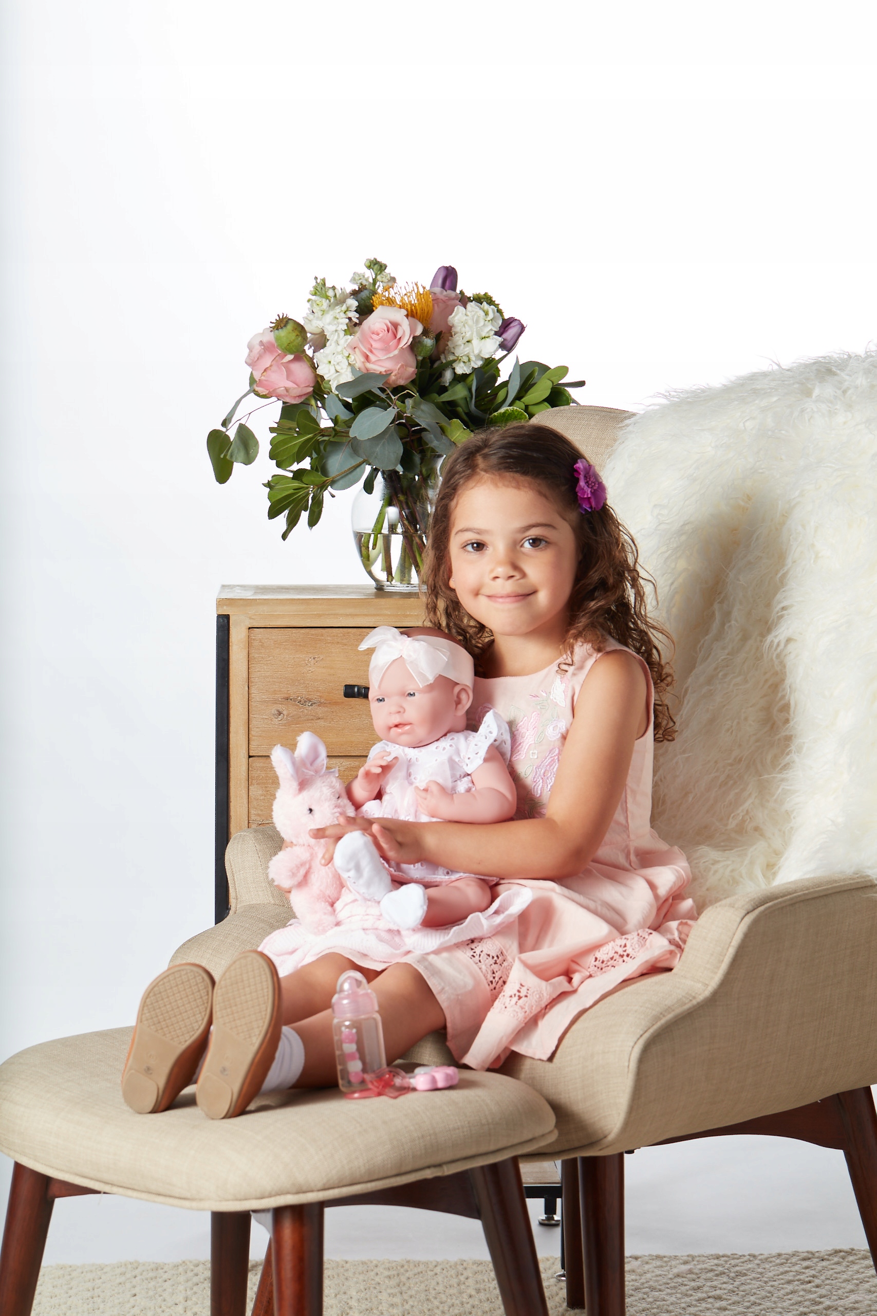 - Одежда как на фотографиях: платье, повязка на голову с бантиком, тканевые туфли, белые трусики – все нежно-розового цвета. Одежда съемная, платье сзади застегивается на липучку.
