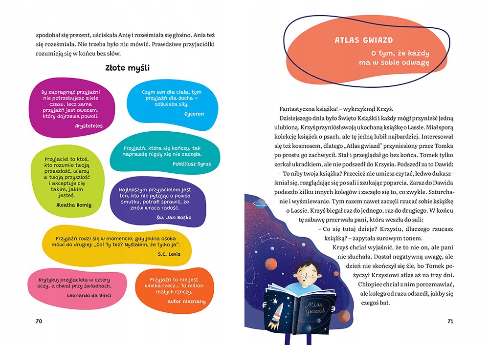 Каждая история говорит о чем-то своем, и все они — о важных вещах: о необходимости взаимной доброты, о маленьких жестах, которые могут иметь большое значение, о том, что важнее — иметь вещи или друзей, о тот факт, что вам нужно иметь смелость добиваться того, чего вы действительно хотите. Золотые мысли, помещенные под каждым из них, облегчат понимание рассказанных историй. Это цитаты известных и малоизвестных людей, содержащие универсальную истину или жизненную мудрость, связанную с содержанием конкретной истории.