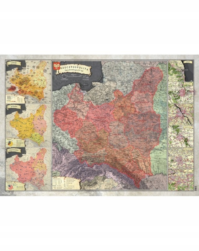 Карты разработаны в виде административных и общегеографических карт, дополненных дополнительным содержанием, касающимся населения, национальностей, религий, природных ресурсов, сельского хозяйства и промышленность. Всего мы создали для вас 28 уникальных карт, благодаря которым вам будет легче понять, каким было Польское государство в то время.