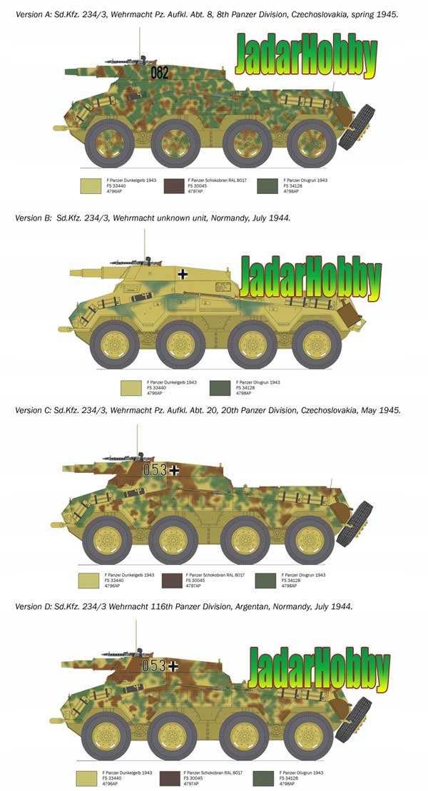 Бронеавтомобили из серии Schwerer Panzerspähwagen Sd.Kfz. 234 экземпляра были произведены немецкой военной промышленностью на заключительном этапе Второй мировой войны. Они отличались высоким уровнем качества конструкции, сочетавшим в себе мобильность, оперативную гибкость и наступательные возможности. Такая конструкция обеспечивала превосходное сочетание скорости на всех типах местности, защиты и огневой мощи, синтезируя боевой опыт, полученный Вермахтом в первые годы Второй мировой войны. Они могли развивать максимальную скорость 85 км/ч. Среди различных выпускавшихся версий Sd.Kfz. 234/3 был вооружен короткоствольной 75-мм пушкой KwK37, стационарно установленной в открытом боевом отделении, которая могла эффективно использоваться для поддержки пехоты против легкозащищенных целей, а также против легкой бронетехники.