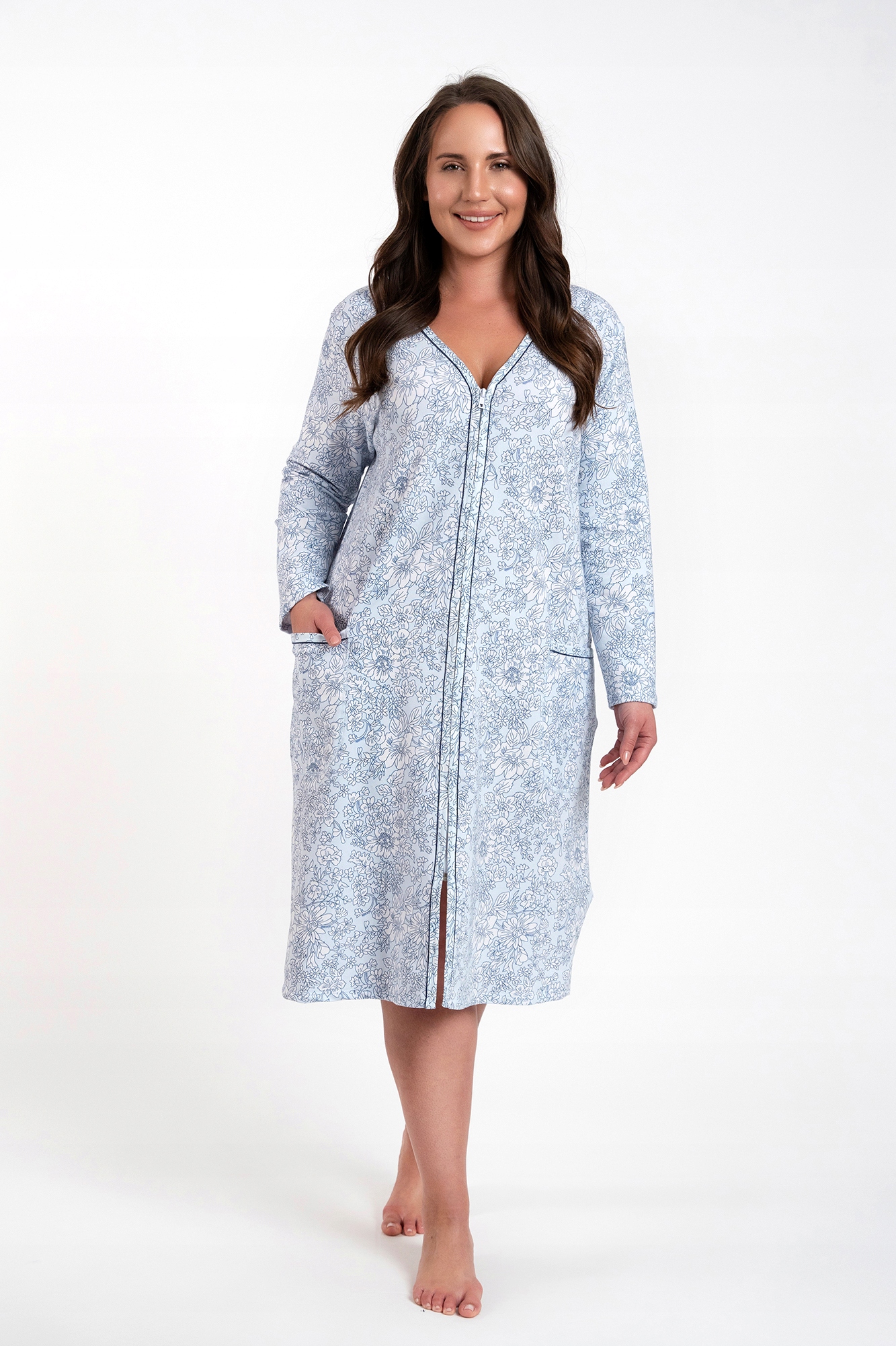 Нет ничего более удобного для прогулок по дому, чем свободный легкий домашний халат-свитшот. Он обеспечивает идеальный тепловой комфорт, исключительно мягок и приятен для кожи. Женское хлопковое домашнее пальто на молнии, V-образный вырез, имеет длину до колена, поэтому обеспечивает комфорт и свободу движений. Красивый узор - нежные голубые цветы наверняка понравится каждой женщине. Домашнее пальто с длинными рукавами подойдет как летом, так и зимой.